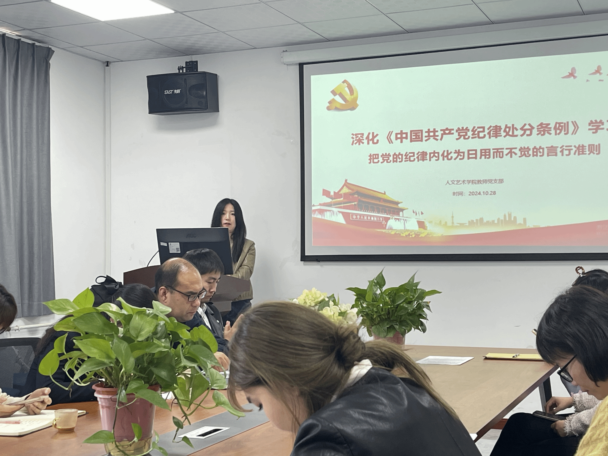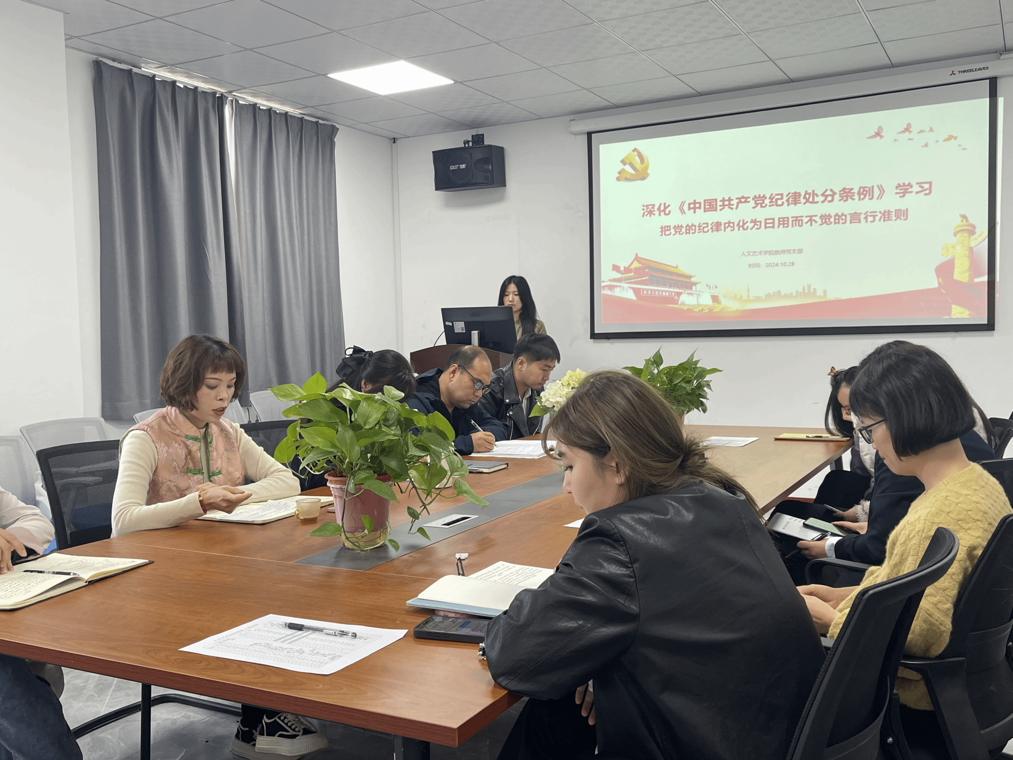 为深化党纪学习教育,善始善终抓好党纪学习教育,将党纪学习教育成效经验转化为推动业务发展强大动力。根据关于印发《中共西安财经大学行知学院委员会认真学习贯彻党的二十届三中全会精神深化党纪学习教育工作方案》 的通知精神,人文艺术学院教师党支部于10月28日下午,组织召开“深化学习研讨《中国共产党纪律处分条例》主题党日活动,切实把党的纪律内化为日用而不觉的言行准则。
